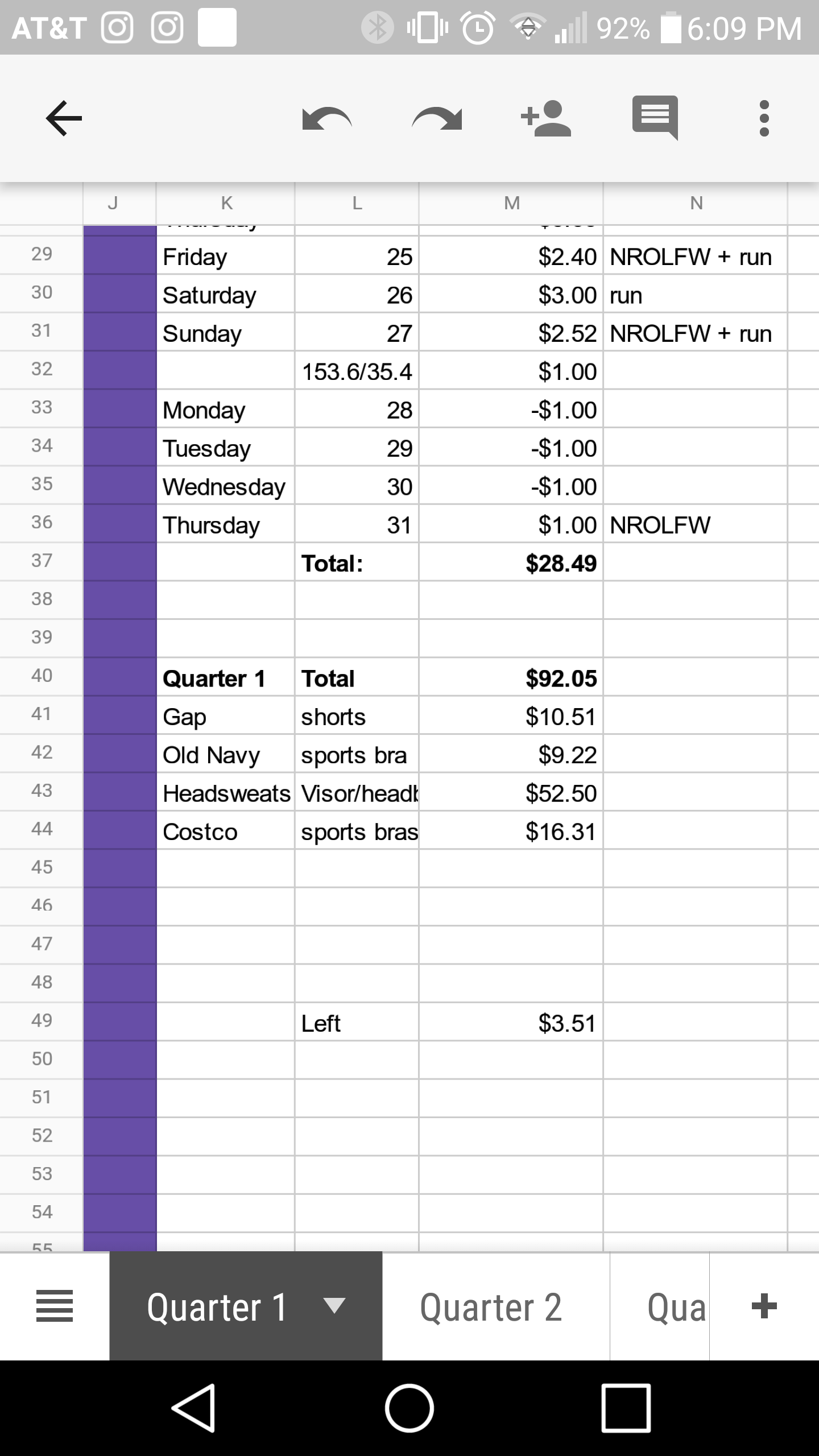 Here are screenshots of the spreadsheet I put together. It is not advanced or fancy but it does the job. I have them separated into weeks but now that I am not using my weight I could take the row out. I weigh myself on Sundays and left a gap to enter my weight. As you can see, I have spent some of the money. After I made the screenshots I moved the quarter 1 balance to quarter 2 and then subtracted the new headphones I bought.