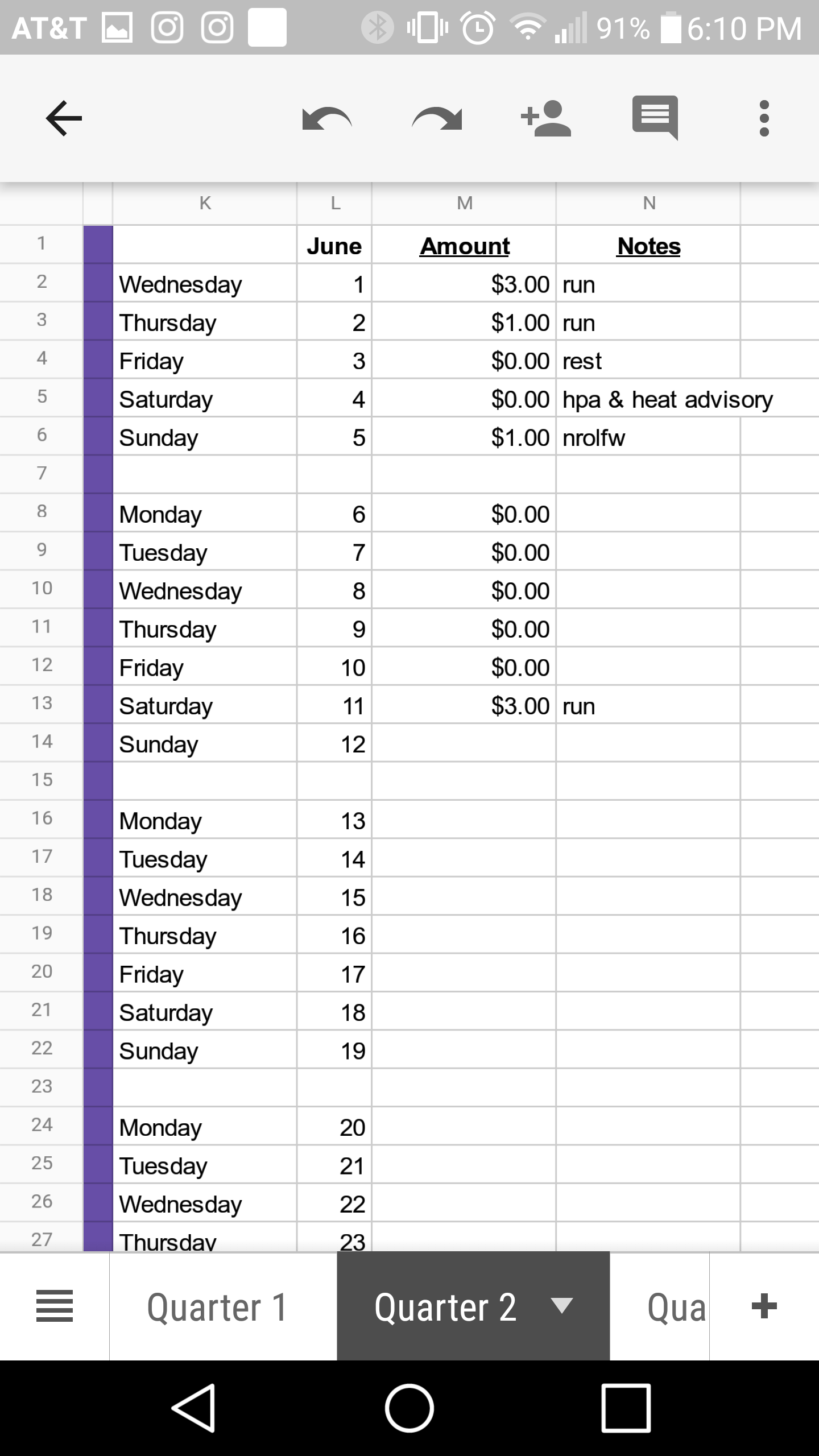 I track it on a Google doc sheets. I have a tab for each quarter and track three months on each sheet. I have four columns for each month. The first is the day of the week, the next column is the date, then the amount, and finally a column for notes. In the notes, I indicate which workout I did or if it was a scheduled rest day. If I didn’t work out I may fill in the reason. Most recently I noted the days with high temperatures and high pollution advisory.
